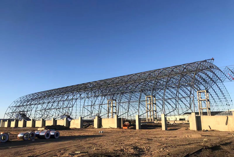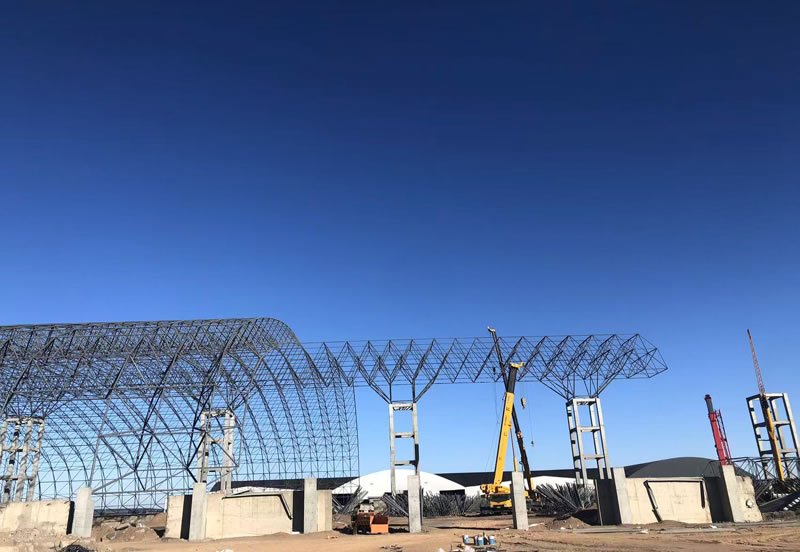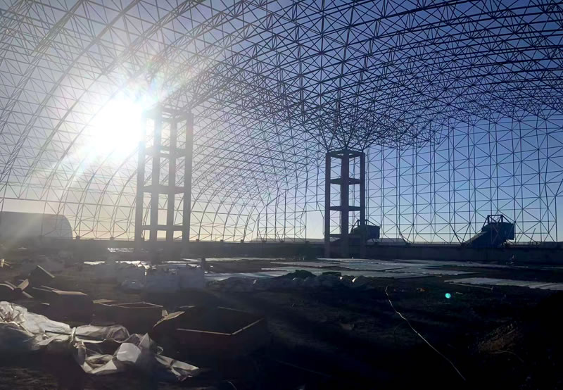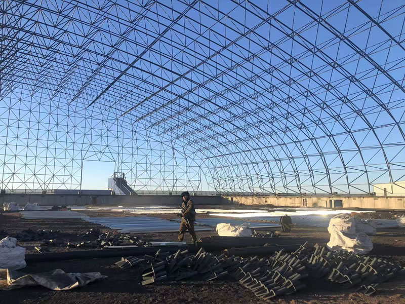 3、材料:正放四角锥螺栓球节点网架,按照甲方确认的图纸设计要求加工制作。网架主材材质为Q355B钢管,底漆二道70um,主檩条镀锌C型钢C220*75*20*3.0,次檩条镀锌C型钢C180*70*20*2.5,屋面板0.5mm厚彩钢单板